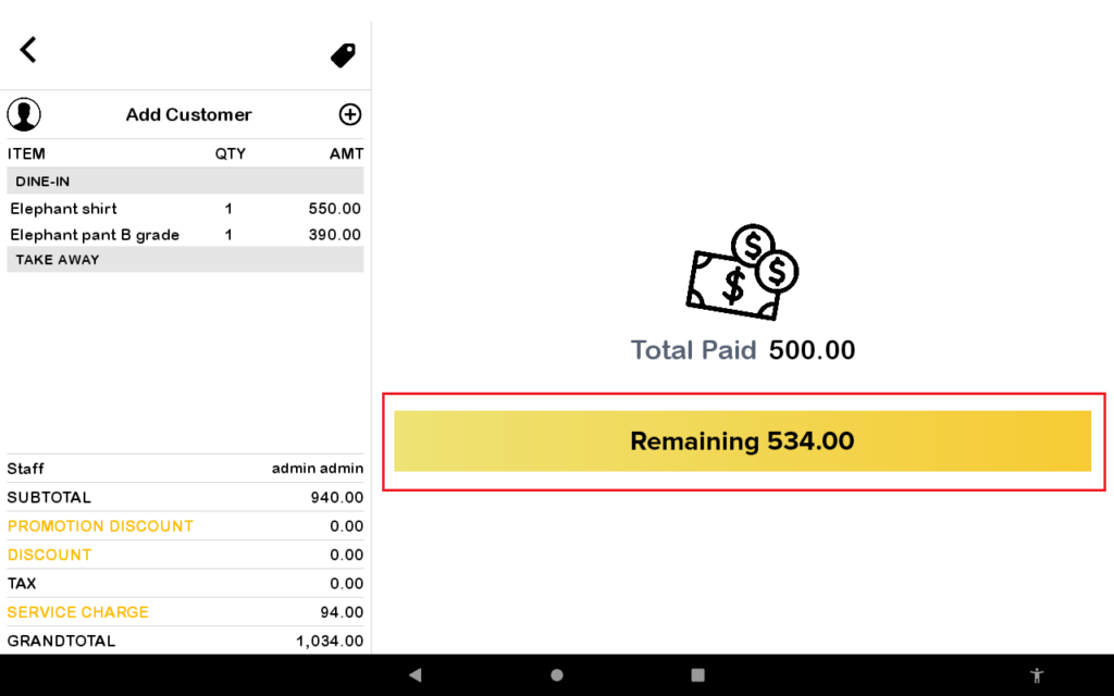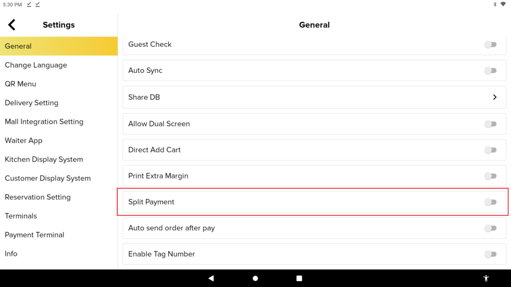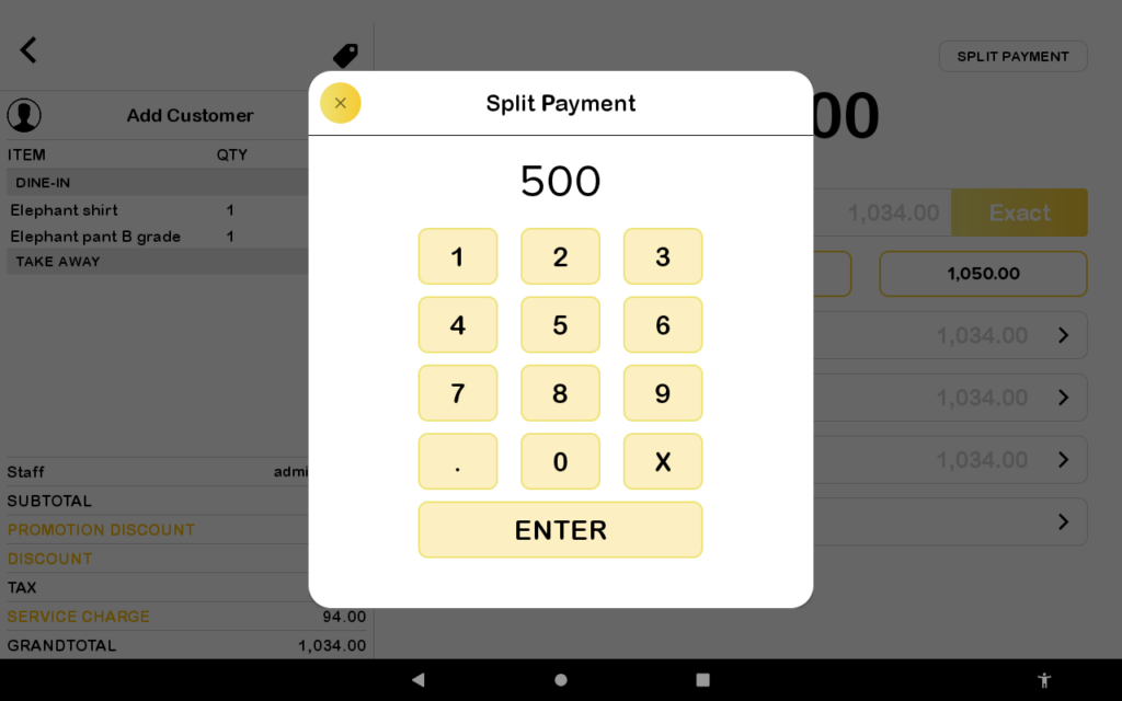 The split payment button has been added in Pro app to allow user make transaction without the need to enable Split Payment in Setting page, unlike previous setting which can be seen in the picture attached below.