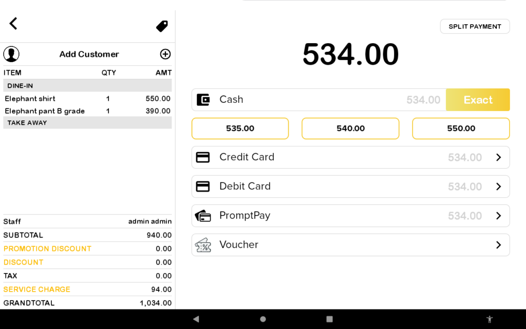 1. Proceed to make payment after you have finished adding item in the cart. Here, user will see the Split Payment button in the payment page.