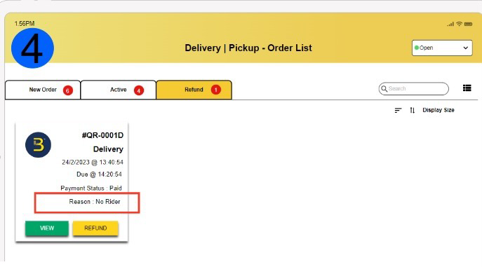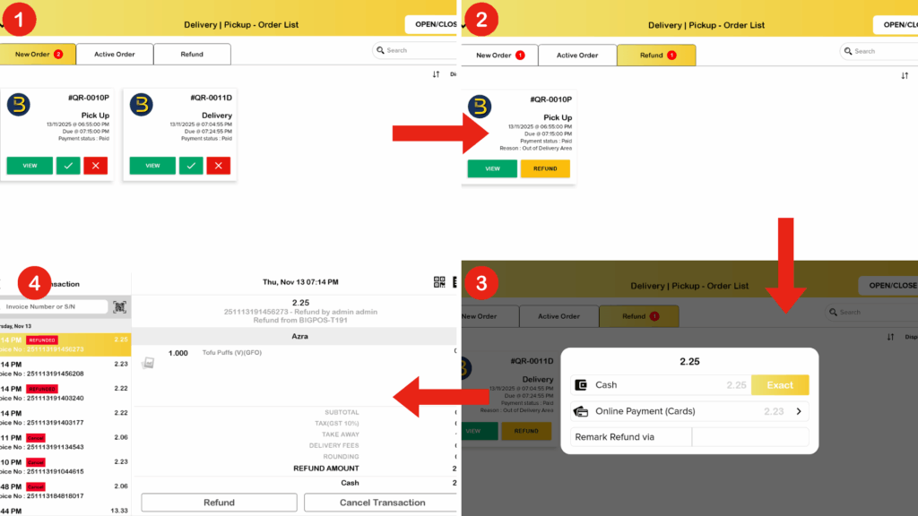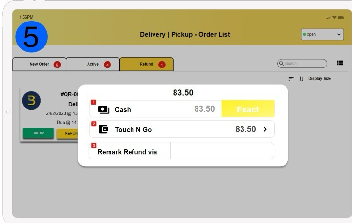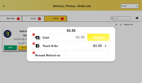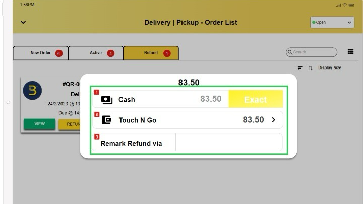 When auto refund fails (because of weak internet connection) the order will move to the Refund tab and customers can choose to refund with cash or online payment.