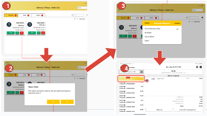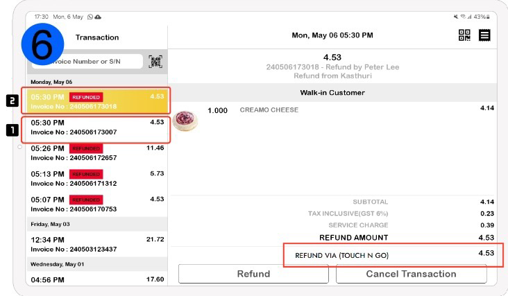 2. Orders paid online can be refunded either in cash or through the online payment method. Remark Refund via refer to selected online payment and will be reflected in the Transaction page.