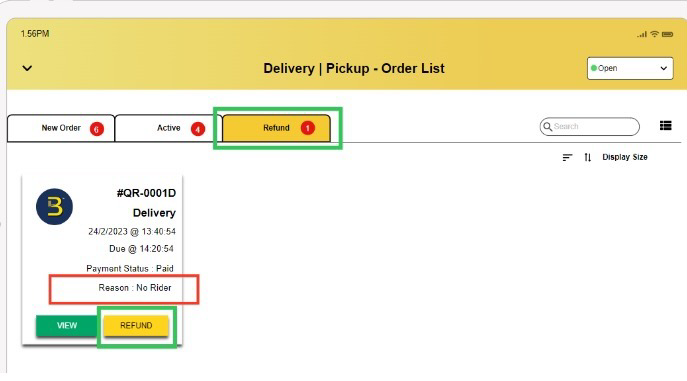 - A new tab called “Refund” has been added to the merchant Delivery | Pickup page. This tab is specifically for handling refund payment from orders that were paid using online payment but later rejected. Merchants need to manually process refunds for these rejected orders by clicking a “REFUND” button.