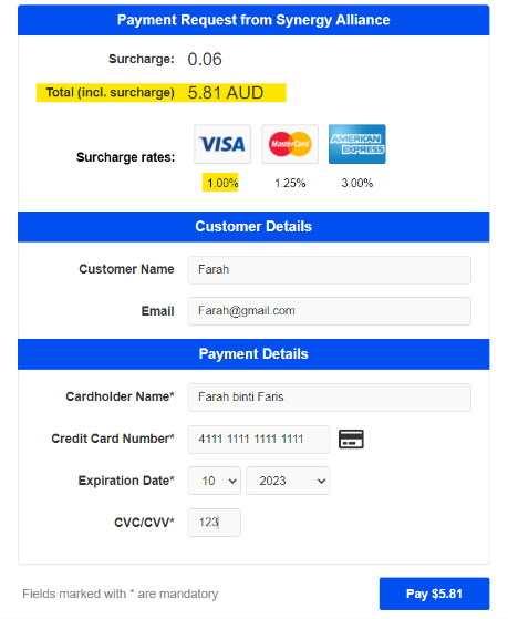 - As illustrated in the figure below, when making a payment using credit card charges, it will display the surcharge rates based on the types of credit cards.