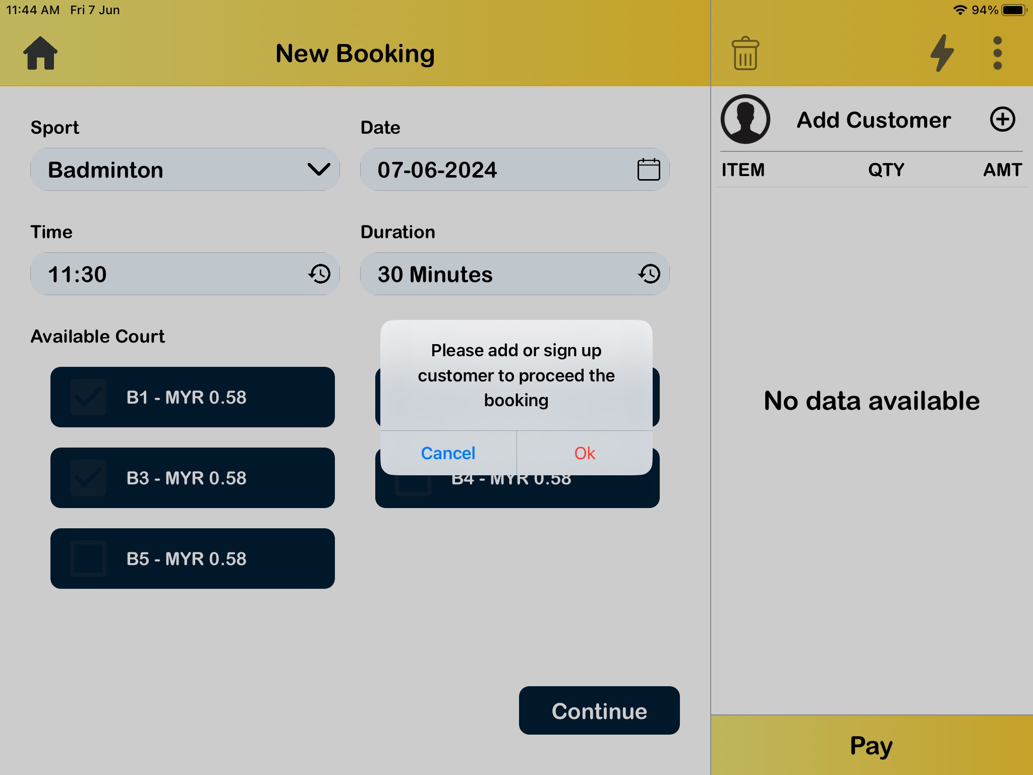 - After make the selection, click ‘Continue’ button to proceed. In order to proceed, assigned customer need to be add to continue the booking. If customer not yet added in the cart, pop out message that alert user to add or sign up customer will prompt out.