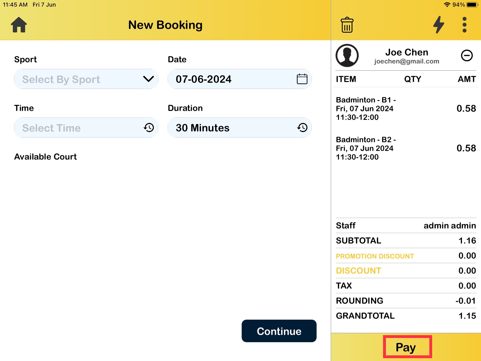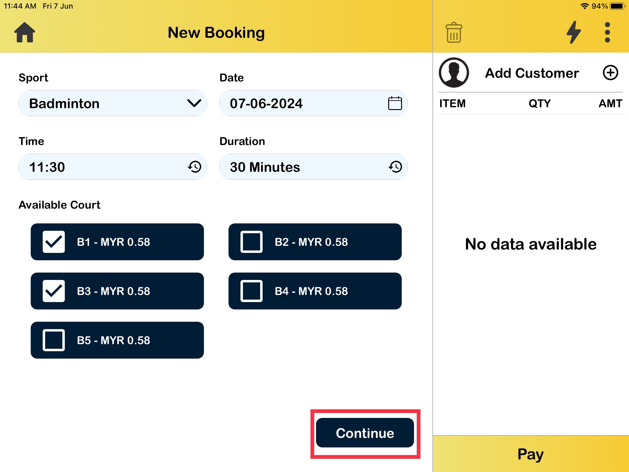 - The available courts on that particular date, time and duration with the total price based on the duration.