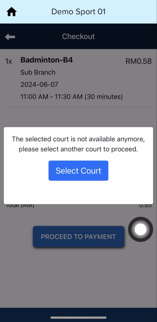 11. For the condition where the court already booked by other customer while made the booking, the toast message that informed the court has been booked will be prompt out once user click ‘Proceed to Payment’.