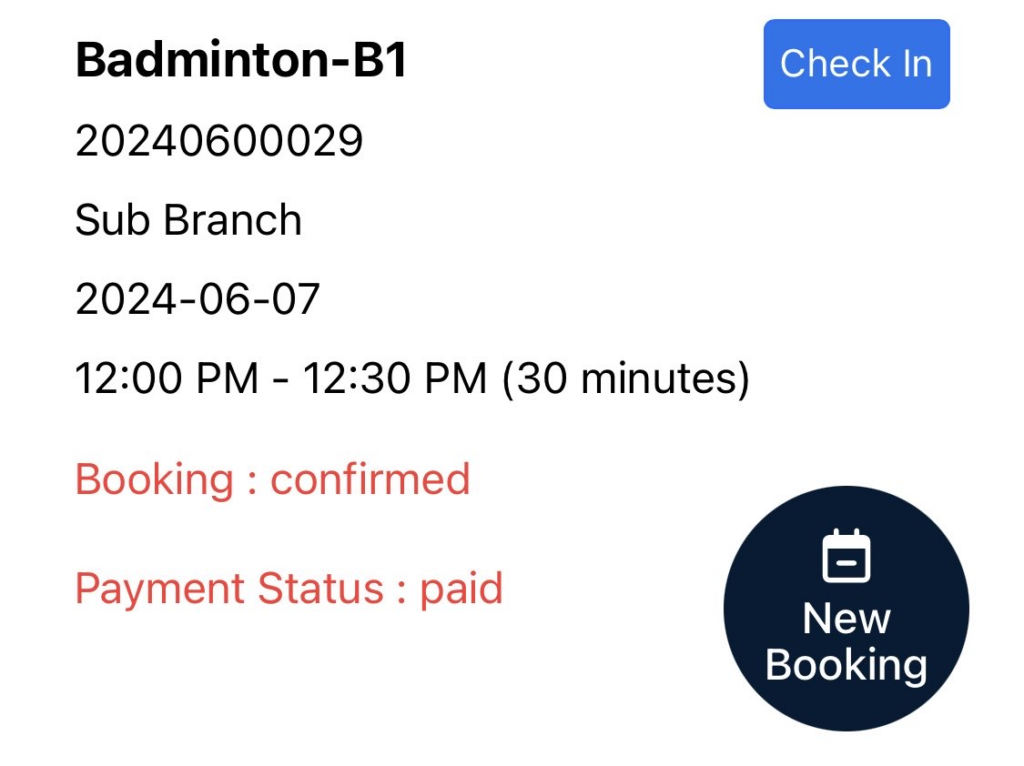 12. For the successful booking, once the timing reach the assigned time, ‘Check – In’ button will appear and user can click that button in order to switch on the court lighting. (notes : ‘Check-In’ button will appear 5 minutes before the booking time, but if click the button earlier, device will not respond until the exact time reach)