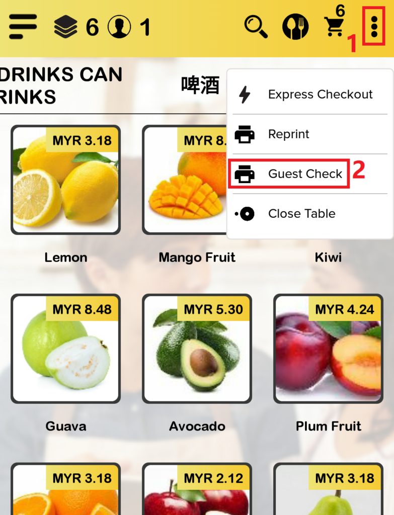 - Select ‘Guest Check‘ from the dropdown menu to print the guest check.