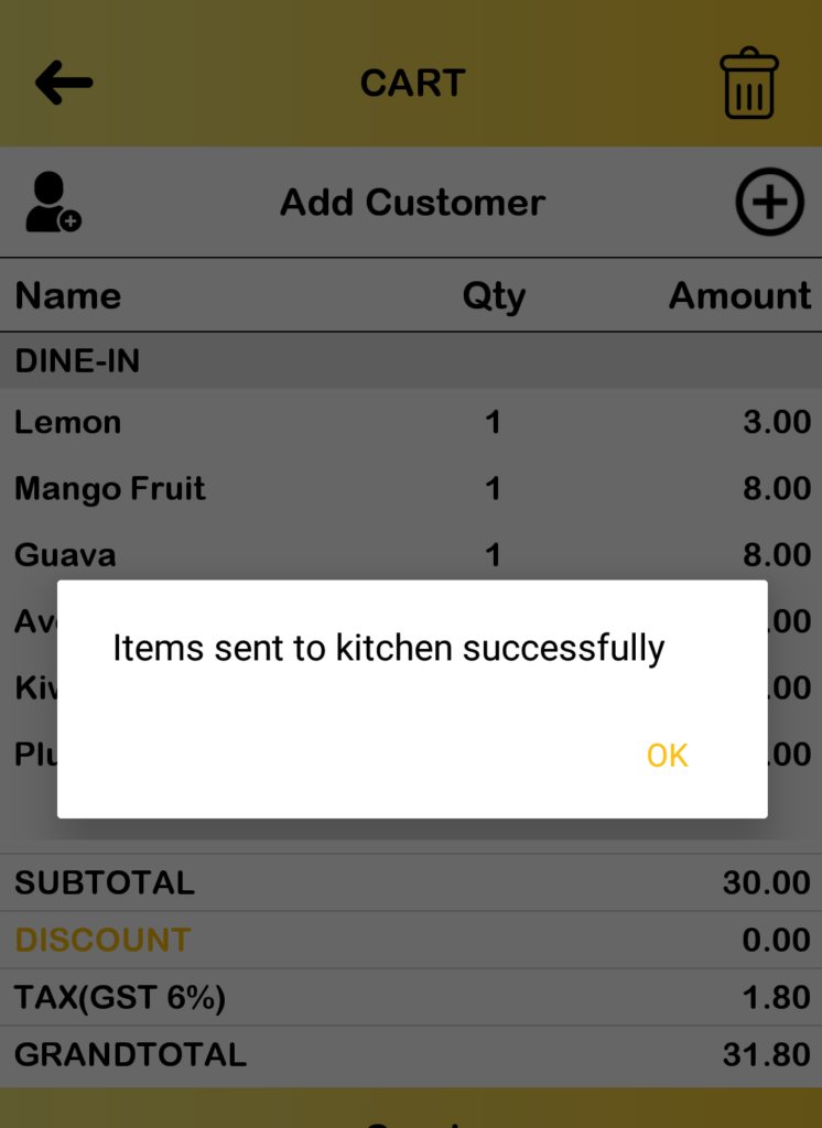 - After successfully sending, a popup message will appear to notify both BIG Waiter and BIG POS Pro regarding the sent order. The connected printer will also print the order sheet and summary.
