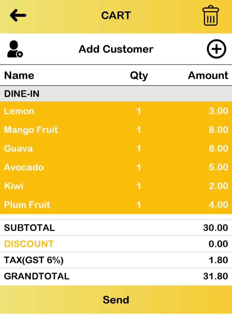 Send transaction is one of the main features of BIG Waiter which is used to notify the host on BIG POS Pro that an order is ready to be processed further such as payment. This section introduces how to send transactions using the BIG Waiter app.