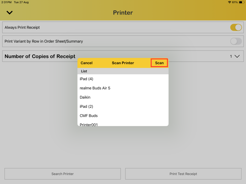 6. Click scan to find your printer device (make sure your Bluetooth is turned on). Select your printer device in the list.