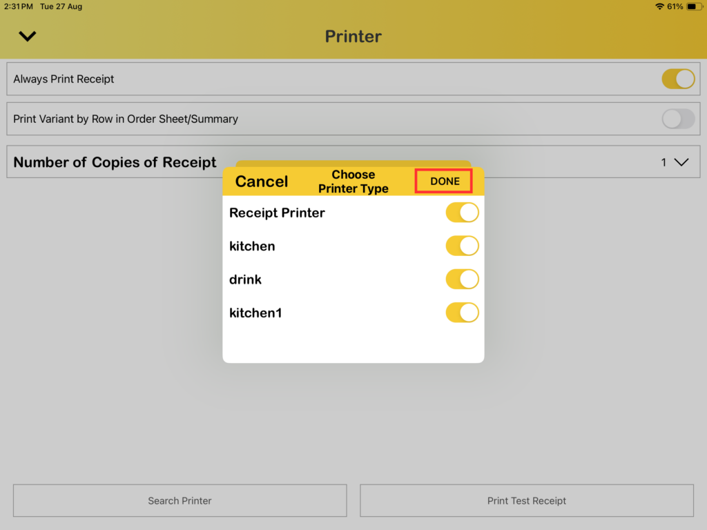 7. You may toggle on all the available printer types listed, and click on “Done“.