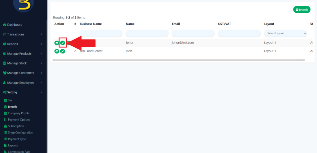 5. To update/edit a branch, you need to click on the pencil icon to update or edit the branch details.
