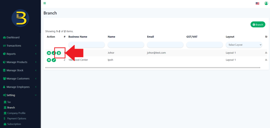 7. To delete the branch, you need to click on the dustbin icon to delete the branch.