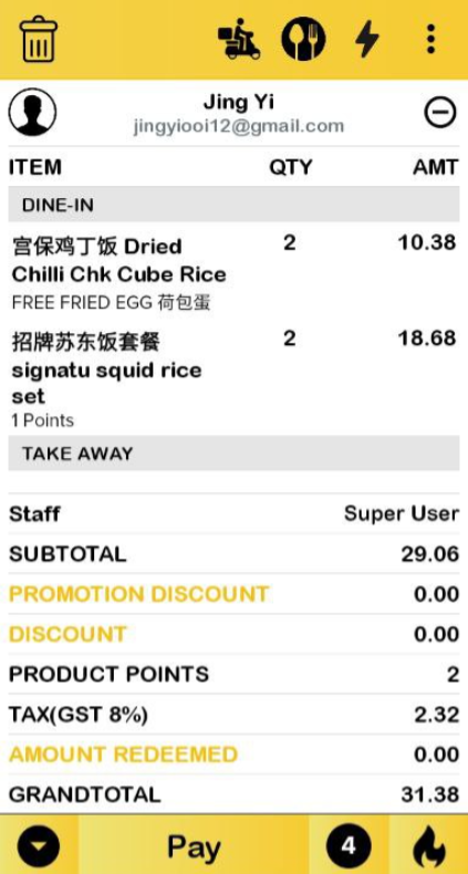 Purchasing Dried Chilli Chk Cube Rice with the quantity of 2 and signatu squid rice set with the quantity of 2. Total of quantity is 4.