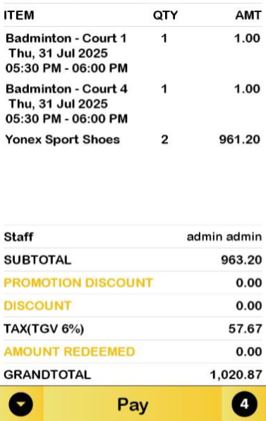 Court quantity always displays as 1 and other products in cart follow the same quantity count as F&B.