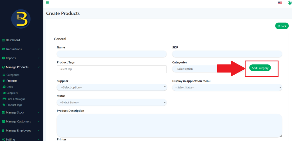 7. When you are redirected to the creating product page, you click on the “Add Category” button to add a new category.