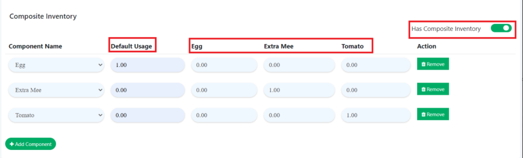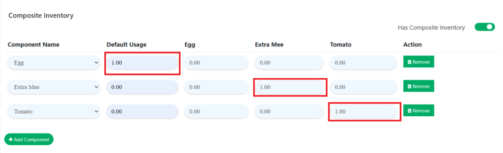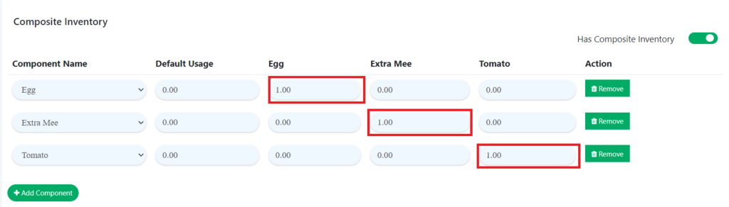 4. For composite inventory, toggle on ‘Has Composite Inventory‘. Then, input the quantity of the component.