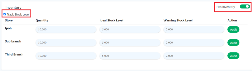 2. For inventory section, make sure to tick ‘Track Stock Level’ and toggle on ‘Has Inventory‘. Ensure to input quantity of the product.