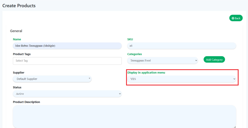 - To create products, go to “Manage Products” and click on “Products“. Select “Yes” for ‘Display in application menu’.