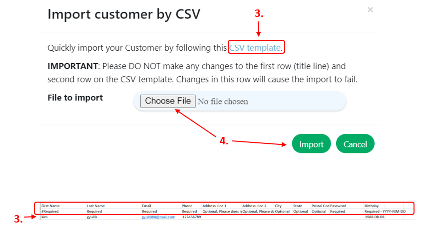 beside the add customer icon which will prompt the user to upload a file. - To get a CSV template, click the ‘CSV template’ button. Below the appropriate template column, enter the new customer’s details. Following the addition of a new customer, save this template with any filename.