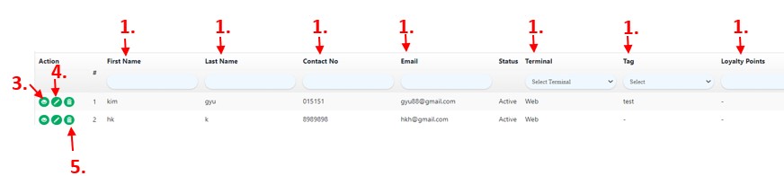 - Filter using First Name, Last Name, Contact Number, Email, Terminal, Tag or Loyalty Points.