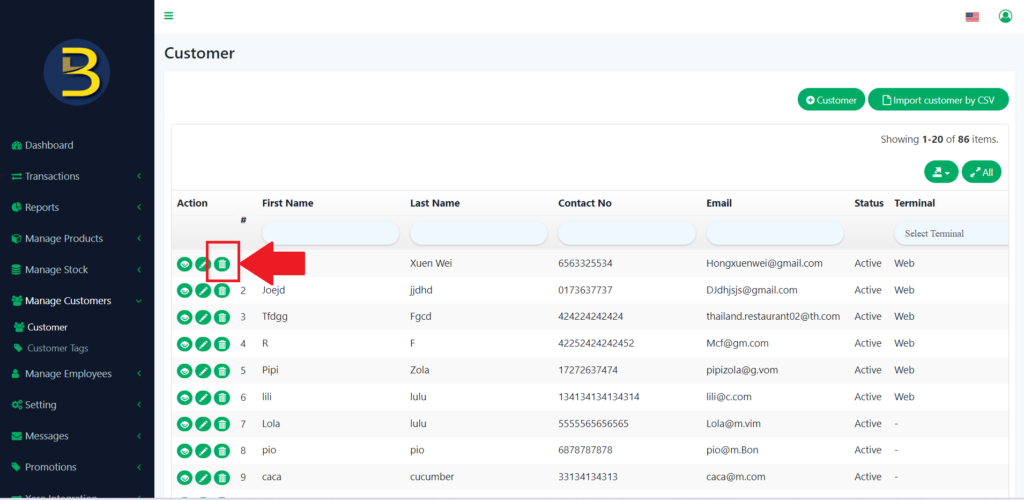 7. To delete the customer, you need to click on the dustbin icon to delete the customer.