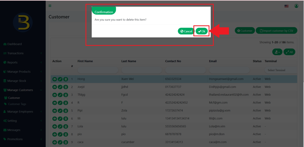 8. There will be an alert message asking for confirmation on whether to delete the customer.