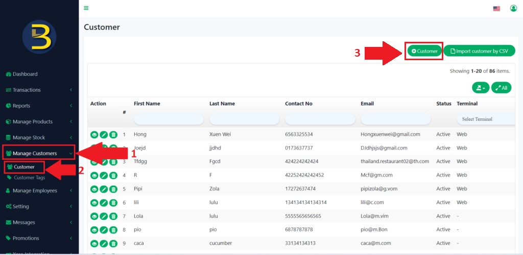 - To create new customers, you need to click on “Manage Customer” to expand the category.