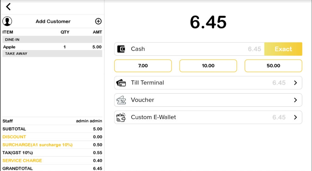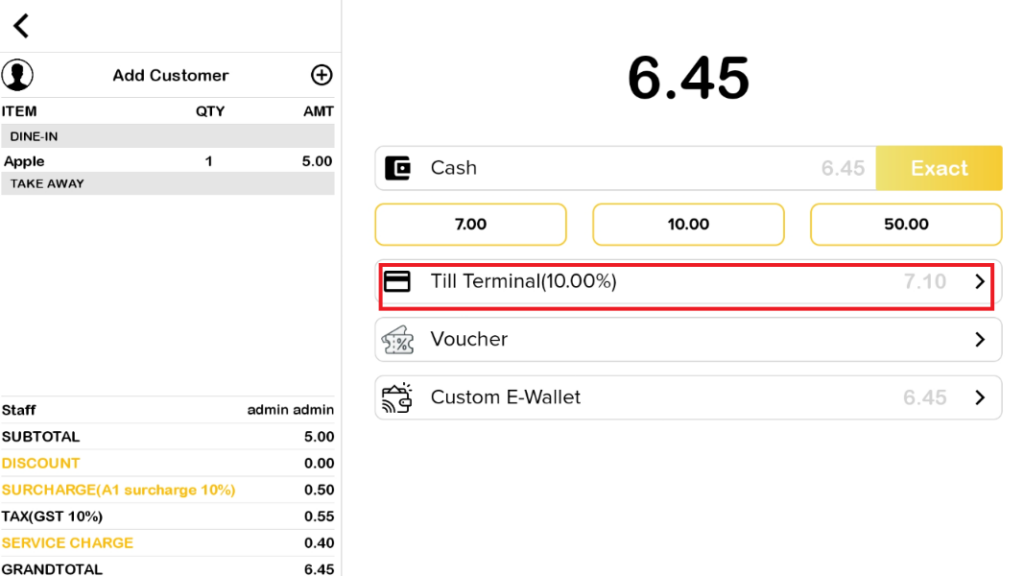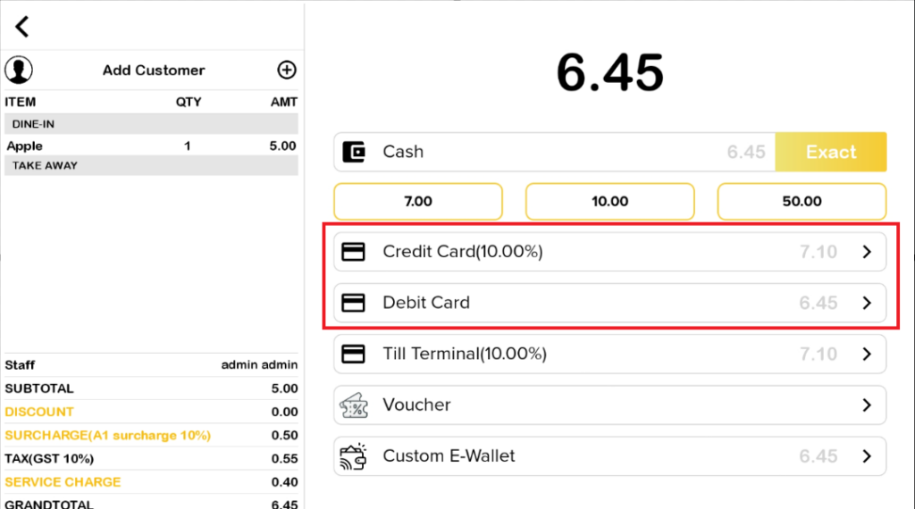 Note: For the surcharge feature, the credit card and till payment options apply the surcharge rate based on the settings from the web admin.