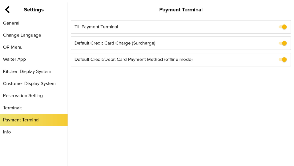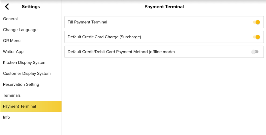 - Navigate to Big Pos Pro, and press ‘Payment Terminal’. Toggles on ‘Till Payment’.