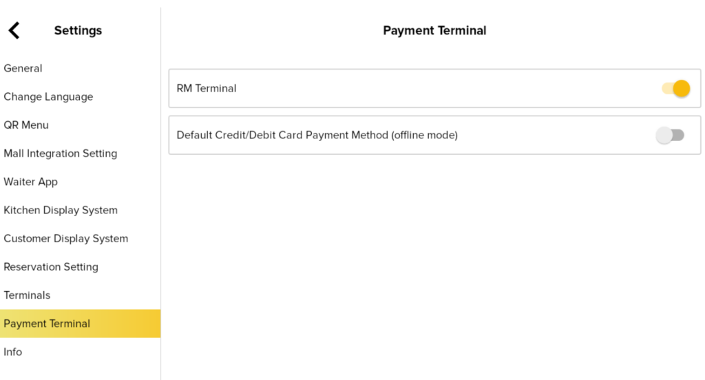 - Go to Big Pos Pro, click on ‘Payment Terminal’ and switch on ‘RM Terminal’.