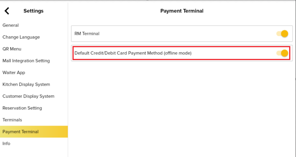 - The user toggles on ‘Default Credit/Debit Card Payment Method (offline mode)‘.