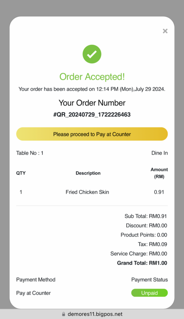 - If user make payment at the counter, the link will expire once the payment has been made. If user use the same link, the QR menu page will show “Invalid Request”.
