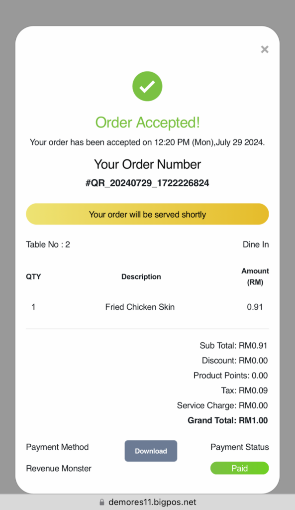 - QR menu order will close the session after customer finish making payment for their order (close table). By means, the qr menu link will expire after payment is made. User need to generate new QR code if they want to add a new order.