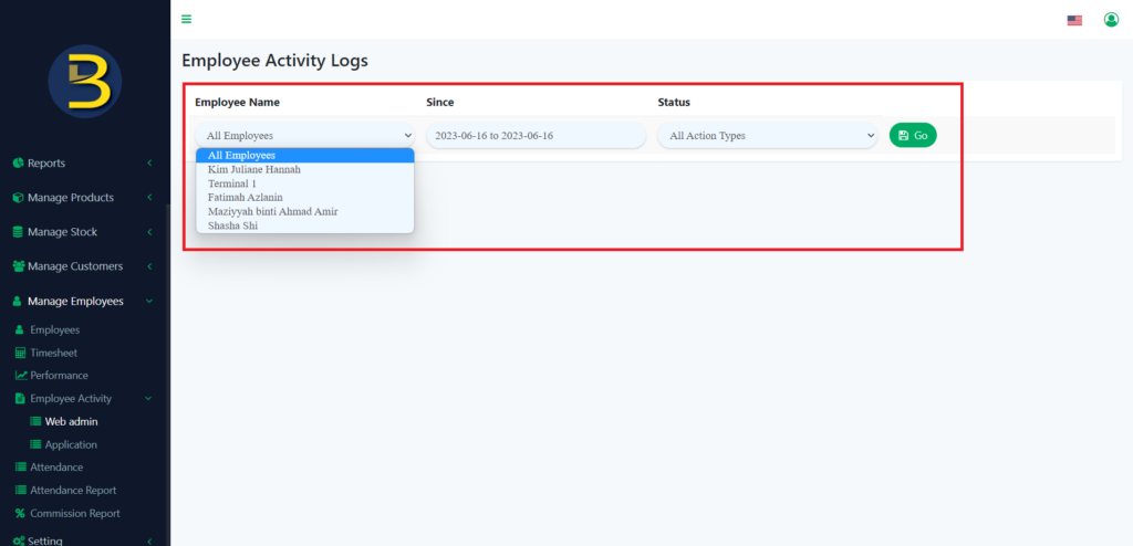 4. Then, you enter the information of where you want to the look for the employee activity in web admin.