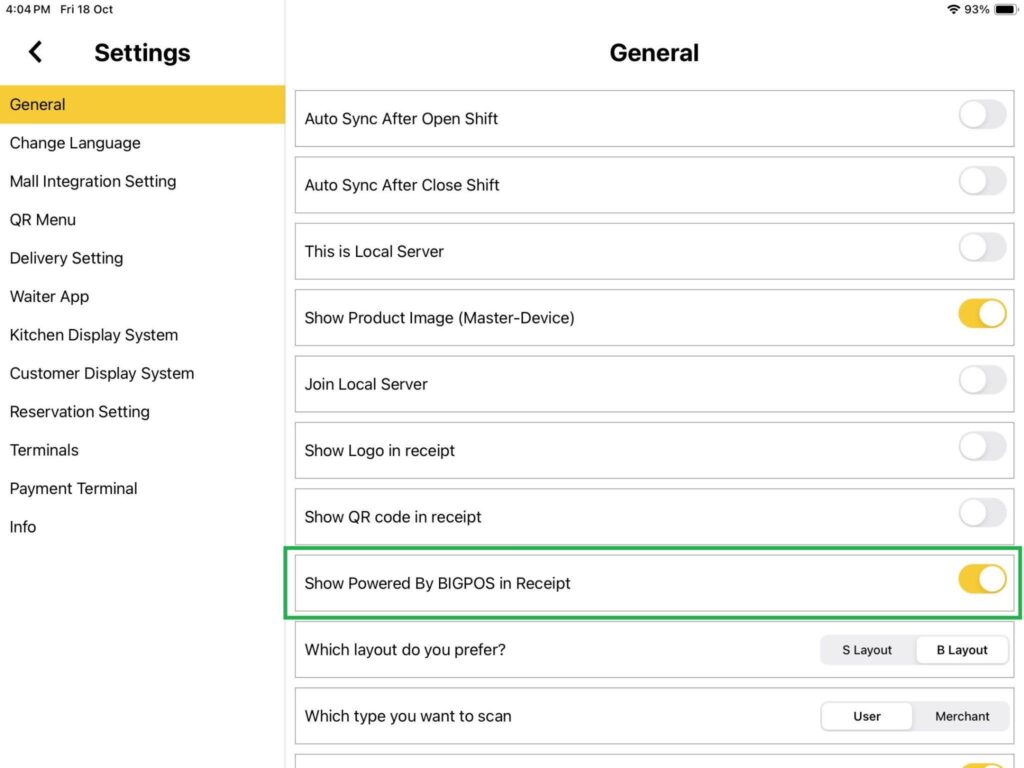 By default, the setting is enabled, meaning the “Powered by BIGPOS” text will appear at the bottom of receipts and guest checks.