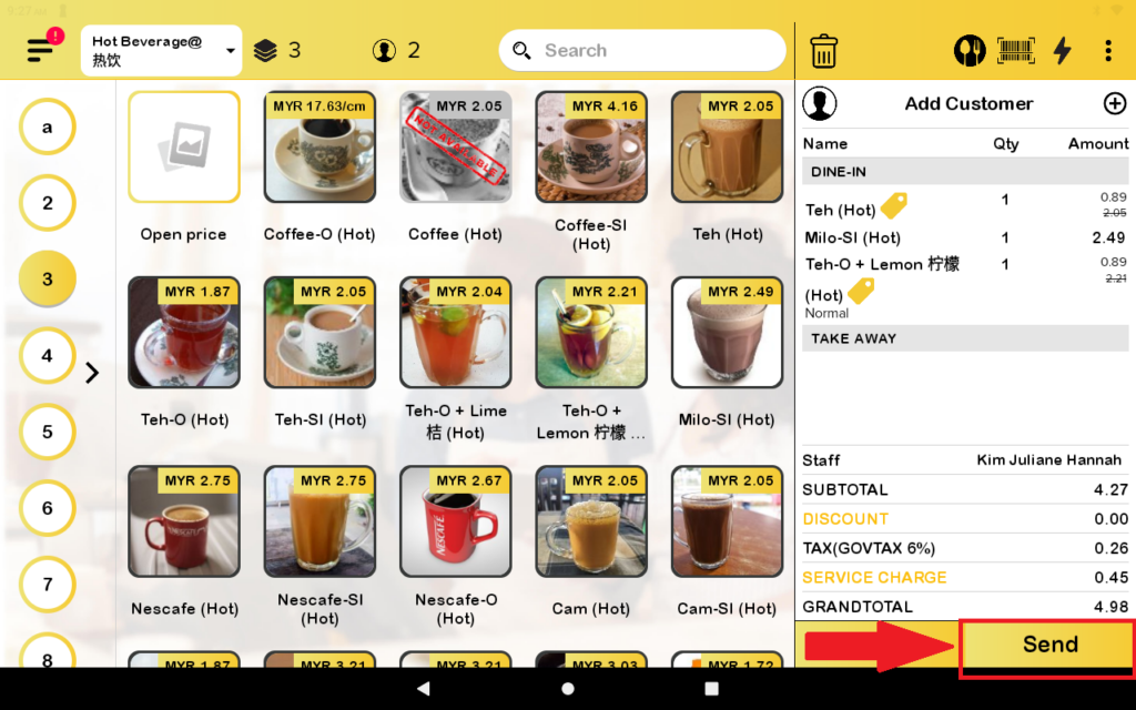 2. Then, you press the send button to print the kitchen order.