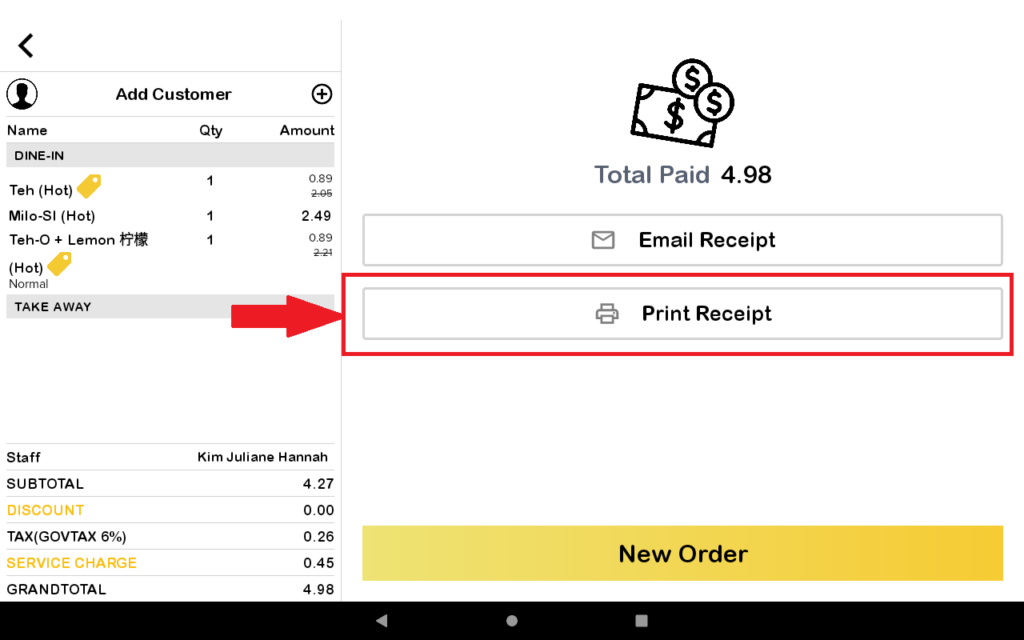 6. After that, you press the “Print Receipt” button to print the receipt.