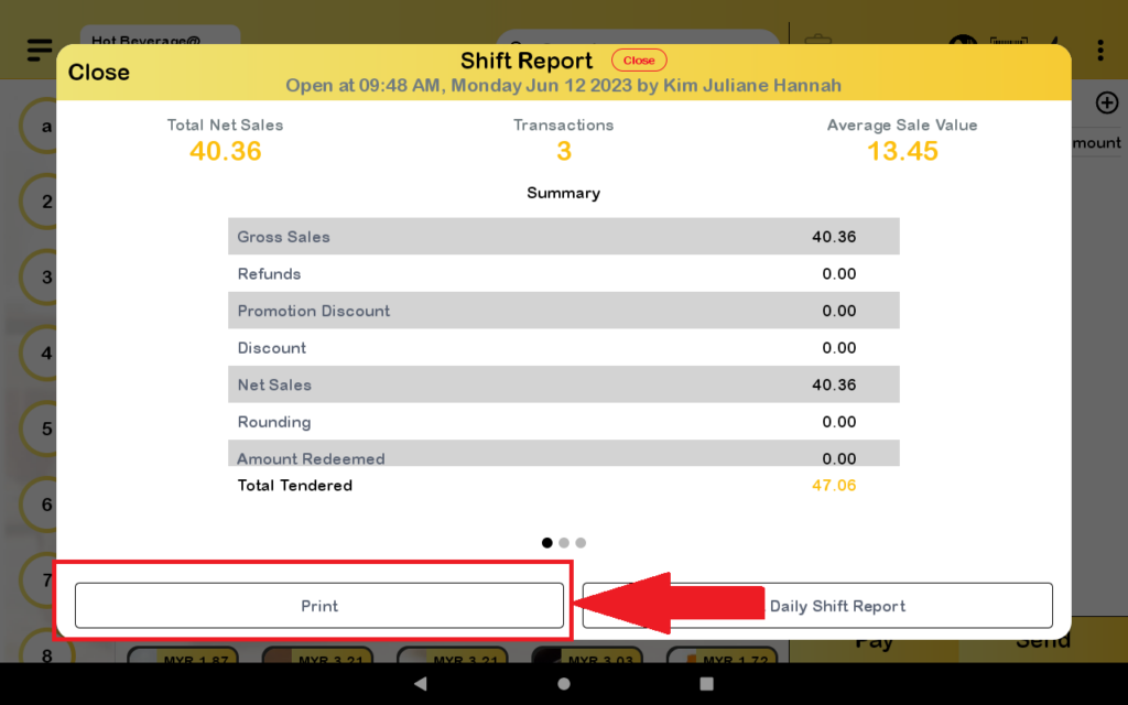 10. The shift report will pop up then you press the print button to print the shift report.