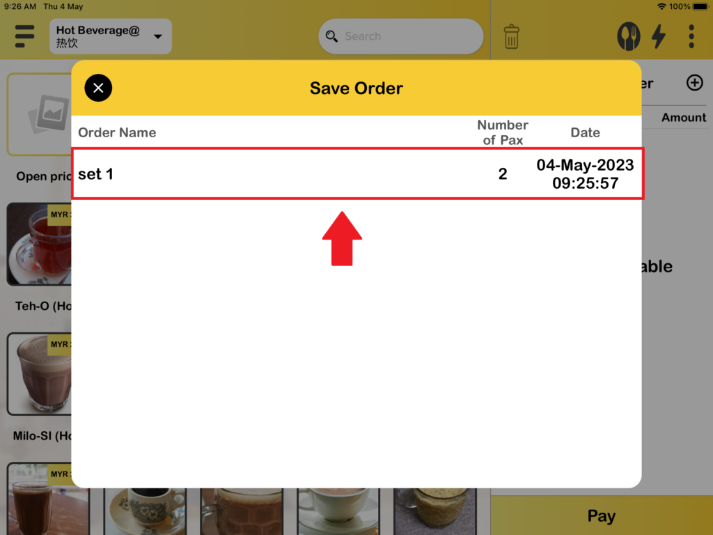 4. You will see the order that you had saved previously and press it to open the order.