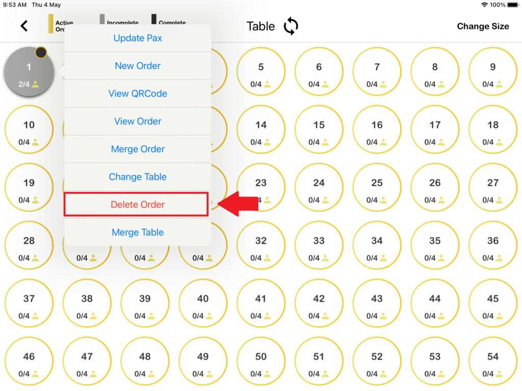 The second way you can find “Delete Order” on the Open Table page is by pressing the table icon. Press it and you will be able to delete your orders.