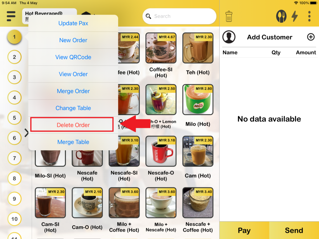 2. When you are in Table number business mode, you can perform “Delete Order” in 2 ways. The first way to find “Delete Order” is by pressing the table icon on the order page. Press it and you will be able to delete your orders.