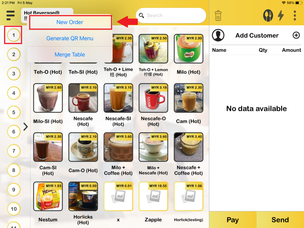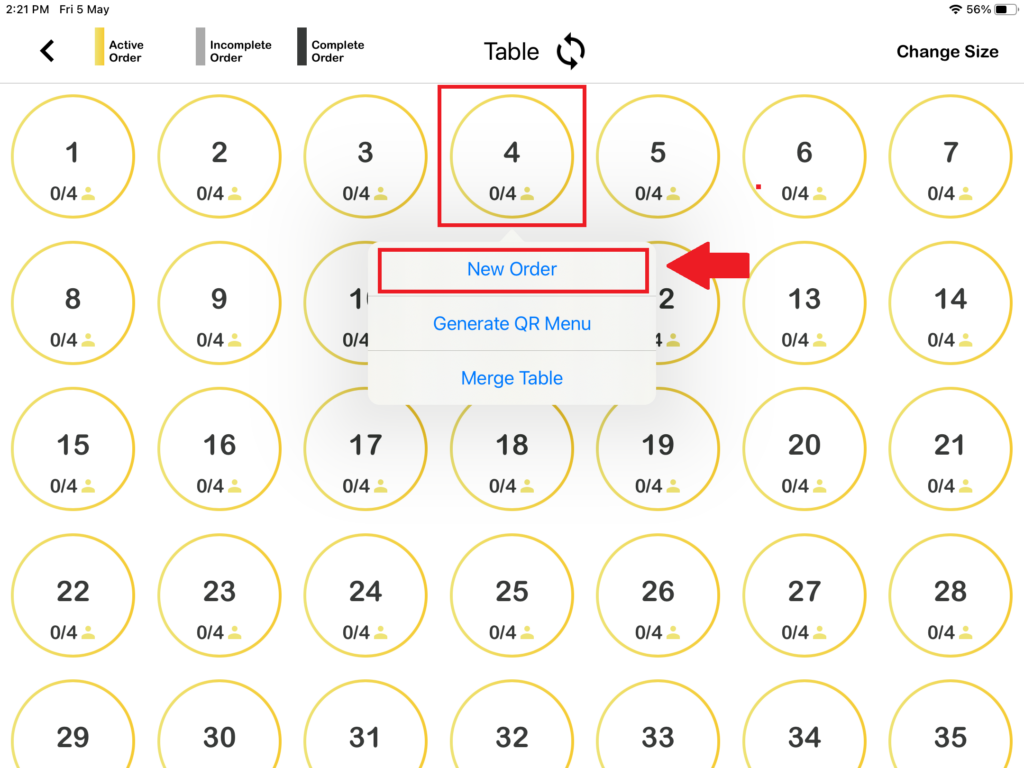 3. Then, you need to press on which table you would like to open, after pressing on the table you will see “New order“.