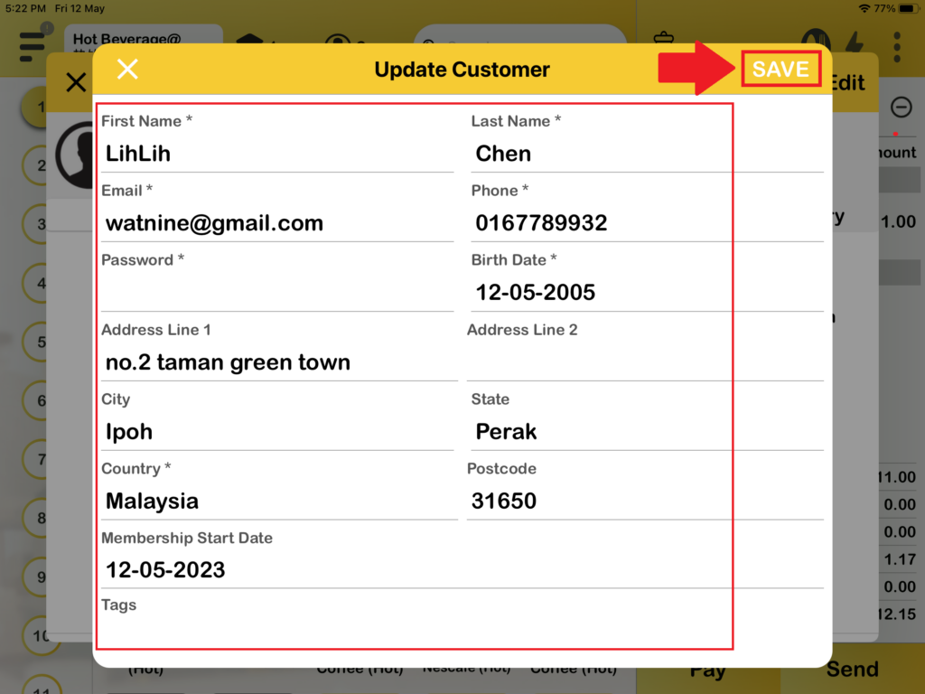 3. After pressing “Edit“, the update customer box shows. You can update customer data and lastly click “SAVE“.