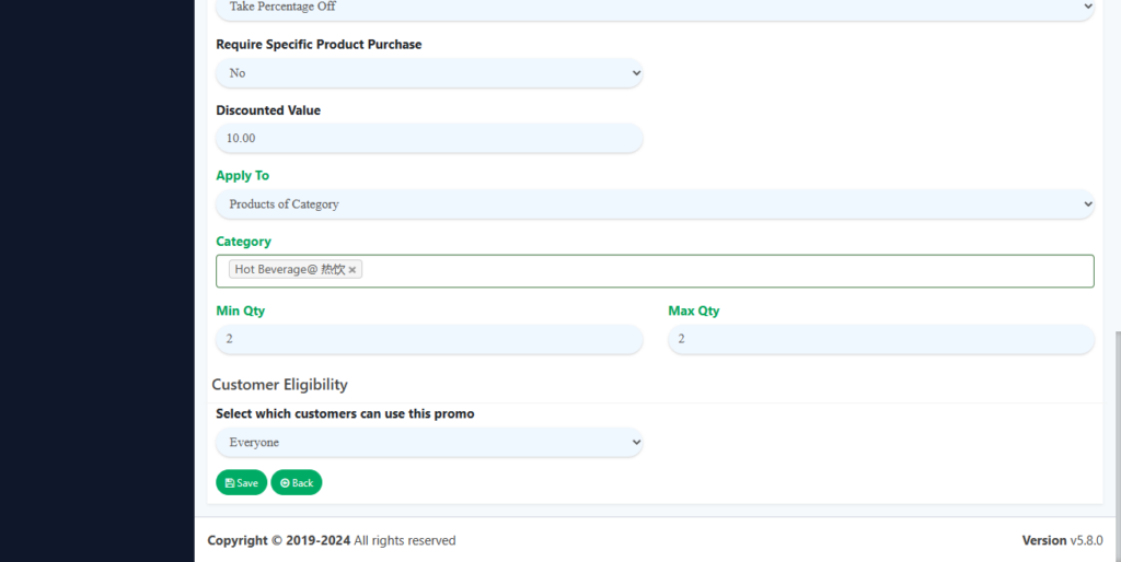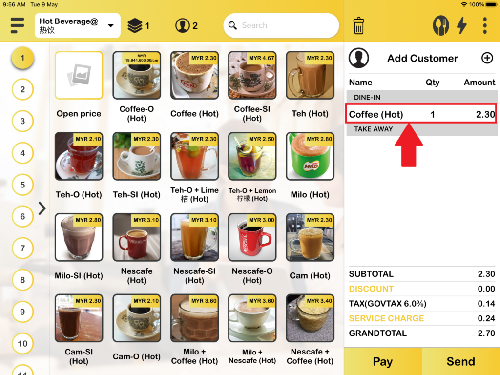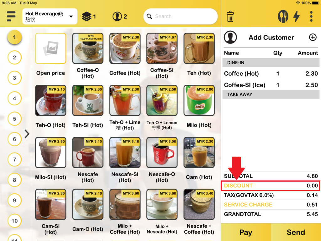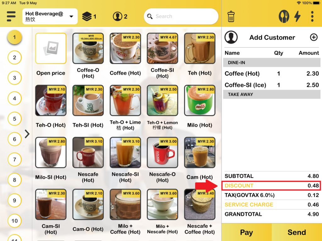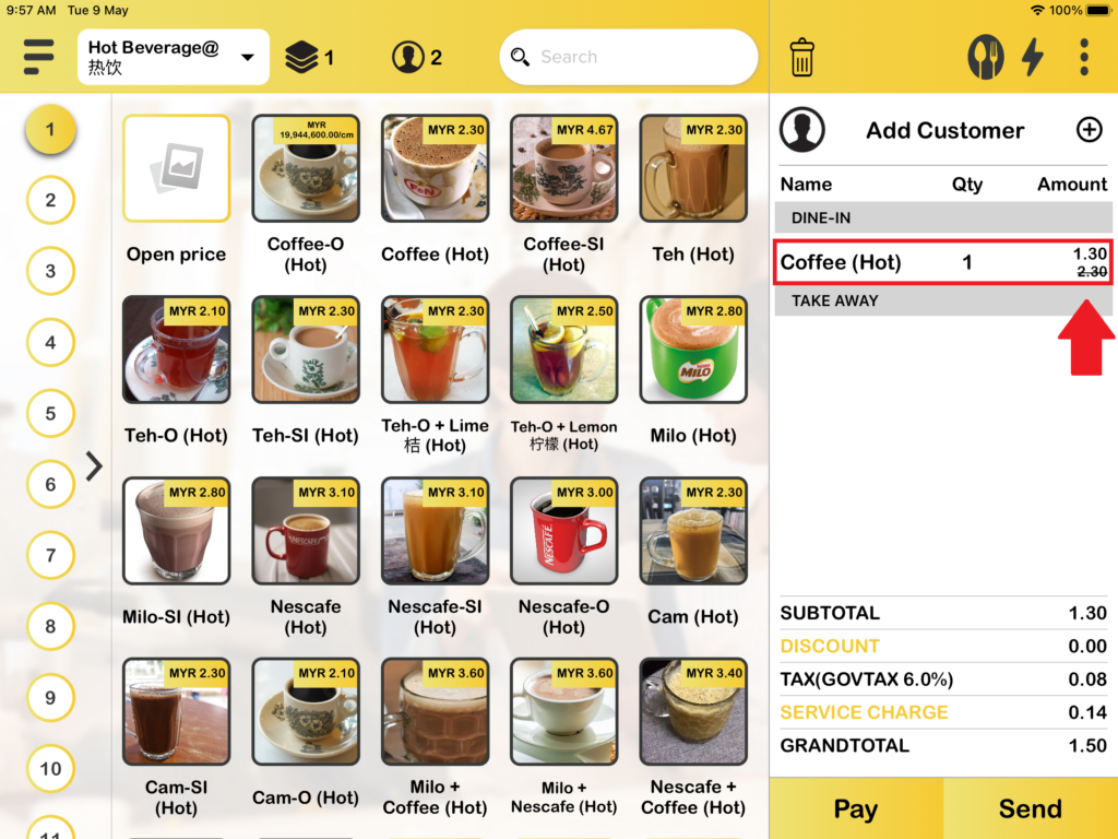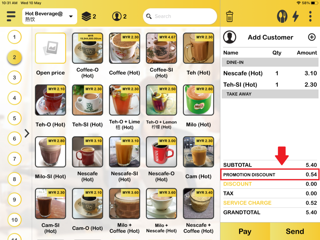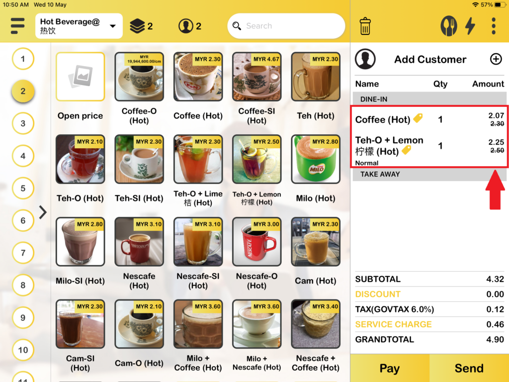 6. I had set product discounts applied to products of categories. The category that I choose is Hot Beverage. The maximum and minimum quantity is 2. So, I will add 2 hot beverage products to the cart, and the product discount will be auto-applied.