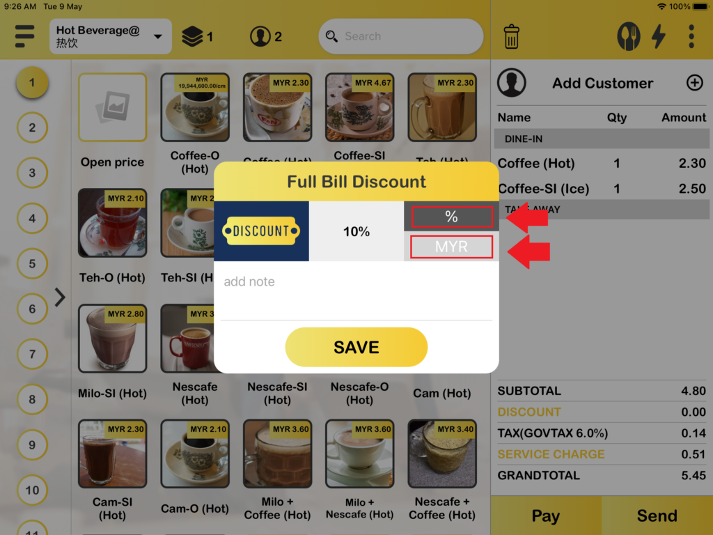 2. Now, you can select Full Bill Discount in percentage or fixed price for the discount. Other than that, you can add your note for the full bill discount too. After that click the “Save” button. and your full bill discount is applied to the cart.