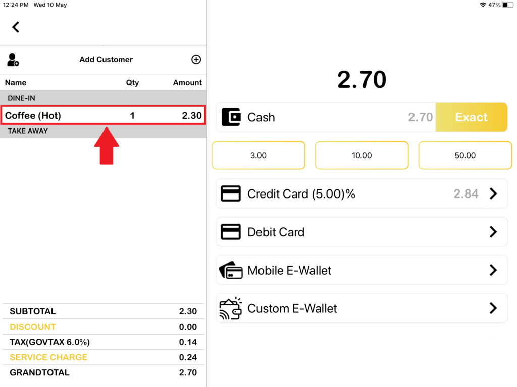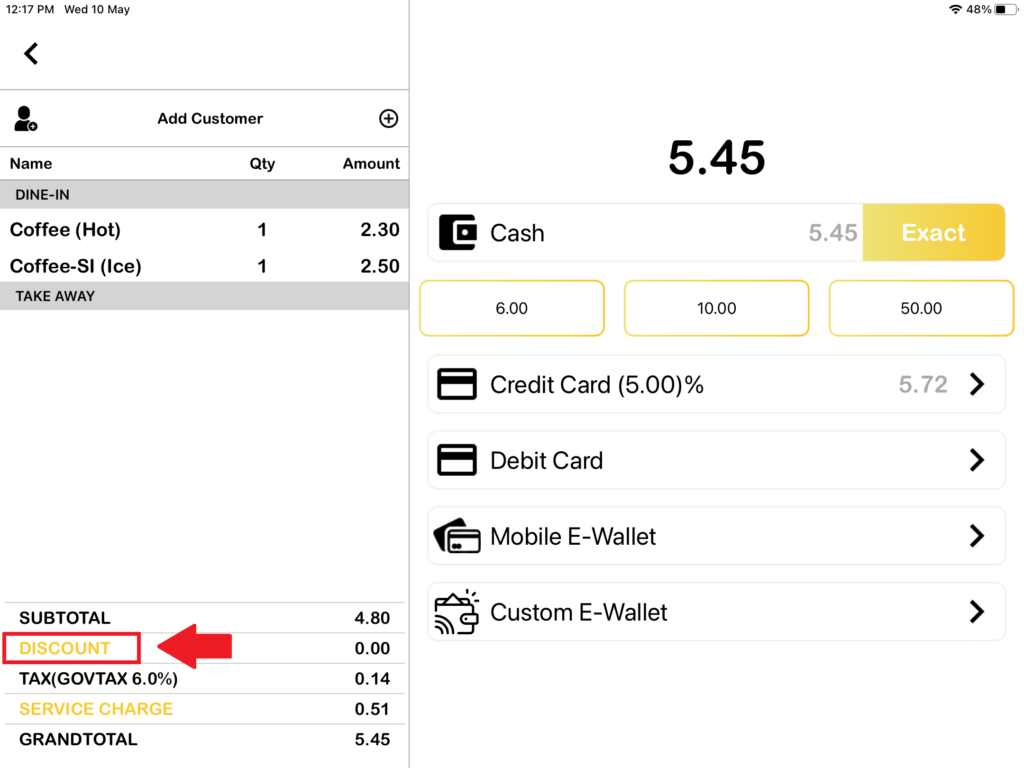 1. First, you need to press which item you want to apply the discount in the cart on the order page and also on the payment page.