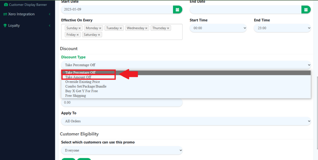 3. In Discount Type, you can choose “Take percentage off” or “Take Amount Off” only.