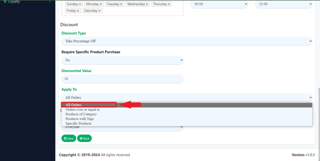 4. Then, you can choose to Apply To “All Orders” which means apply for a full bill discount and click “Save“.