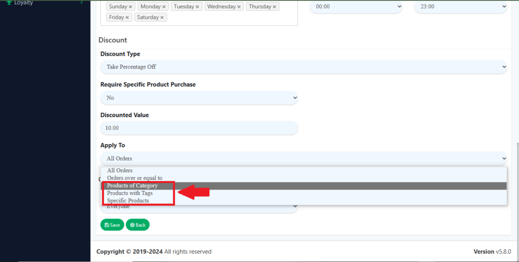 4. Then, you can choose to Apply To “Product of Category“, “Products with Tags“, or “Specific Products” which means apply for a product discount and click “Save“.